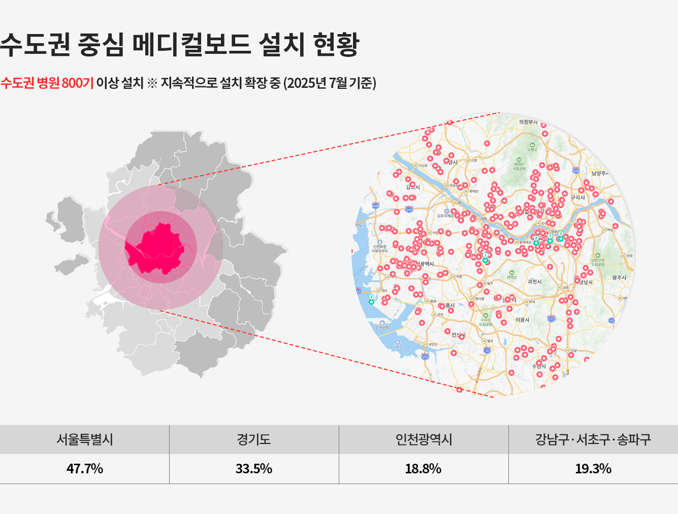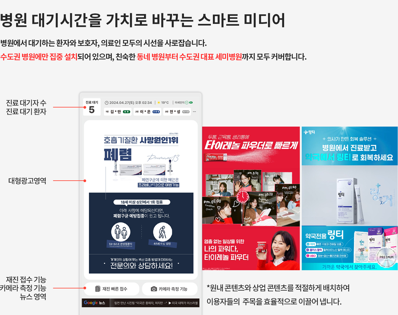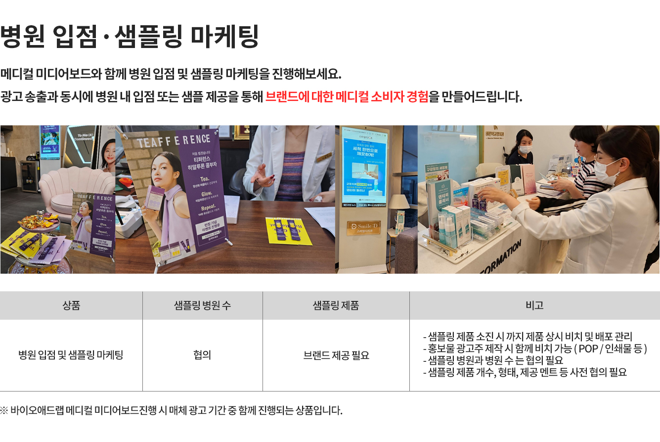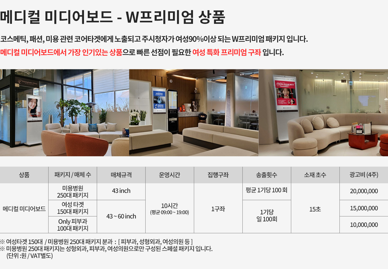 성형외과, 피부과등 구구매력 높은 잠재고객을 타겟으로 만든 매체로수도권 병원 800기 이상 랜드마크 병원들에 설치되어 노출되는 매체입니다.